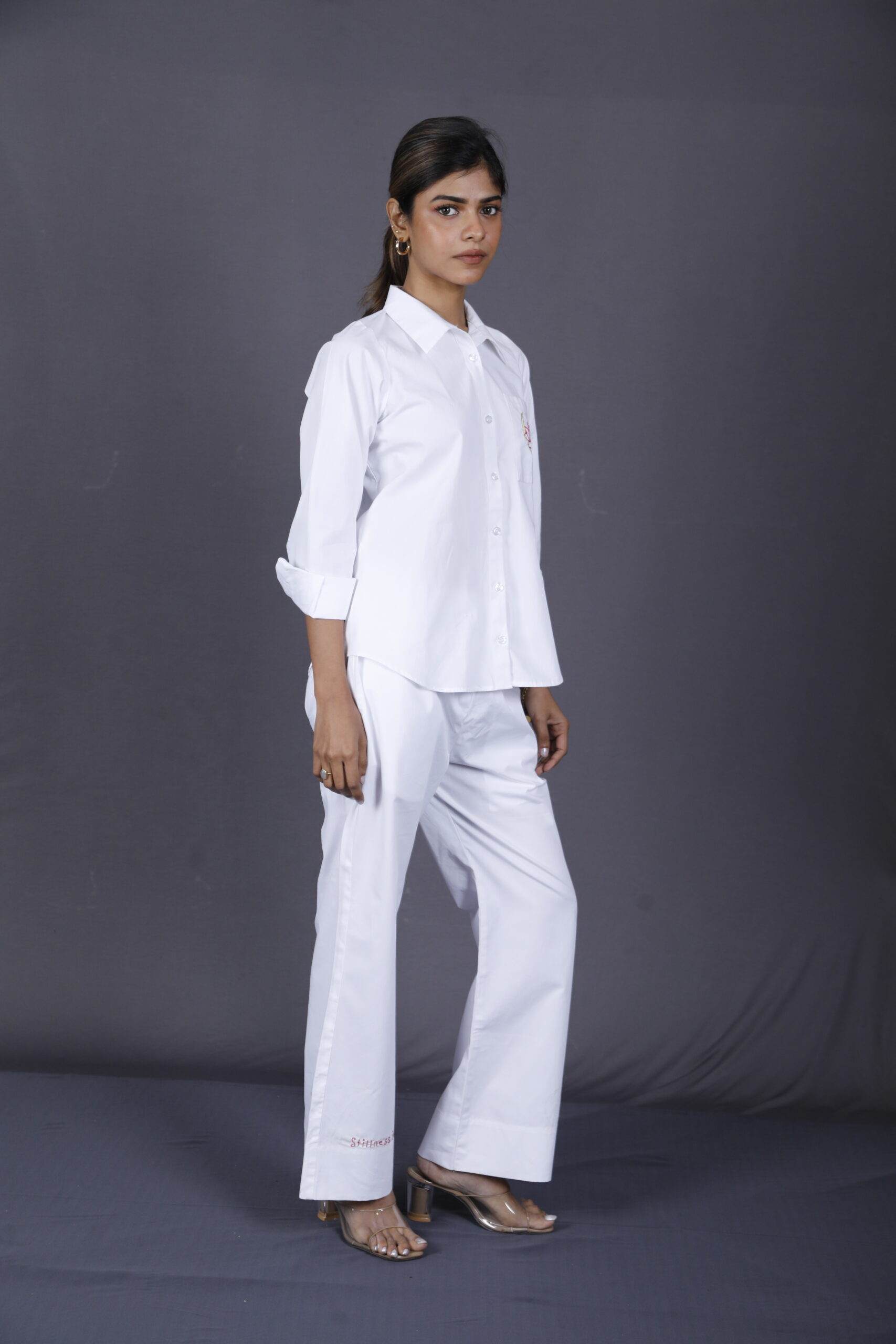 A refined expression of calm elegance, this thoughtfully crafted co-ord set blends minimal design with meaningful details. The shirt is beautifully adorned with lotus and half-moon embroidery on the pocket, symbolising balance and inner grace. Paired with it, the pant features a hand-embroidered phrase “Stillness in Bloom,” adding a quiet statement of mindfulness. Crafted in premium poplin fabric, the set offers a soft, breathable feel with a structured silhouette that’s perfect for everyday sophistication.